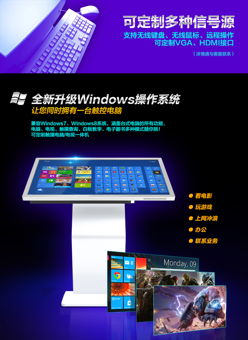 (2)顯示、觸控、PC系統一體化超薄設計;取消傳統顯示器、主機、音響、外設分離模式,高度一體集成,銜接更好、節約空間;更簡潔、更節能;